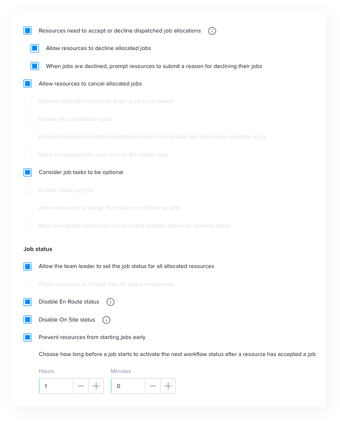 It is important to note that the workflow settings are global and will apply to all job types within your solution. This is especially important if you are using Skedulo across multiple business areas as the settings applied here will effect everyone. If you are scheduling for multiple types of services or business areas, we advise you talk through the options with all stakeholders across the company.