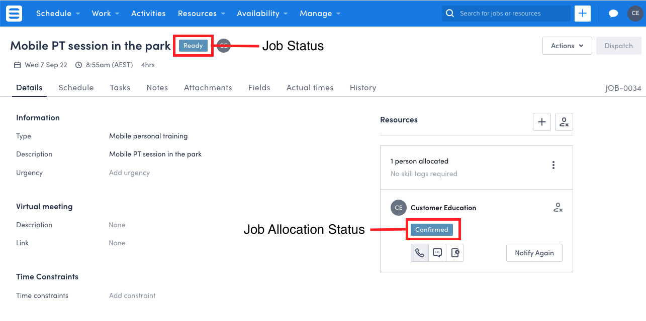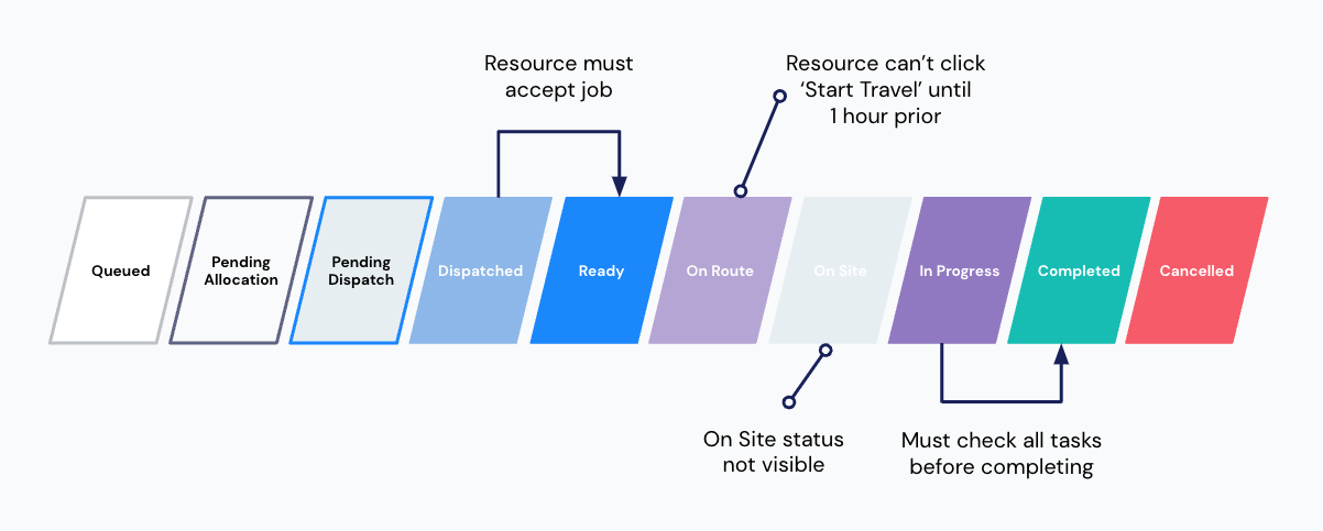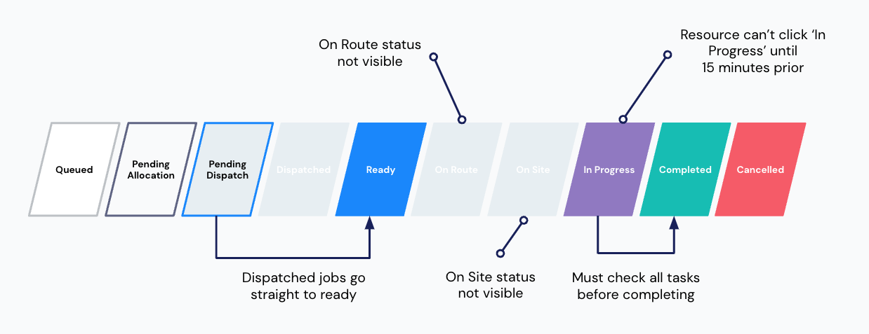 | Dispatched | A job notification has been sent to the resource(s) and is located on the notifications view of the resource(s) mobile app. | Dispatched |