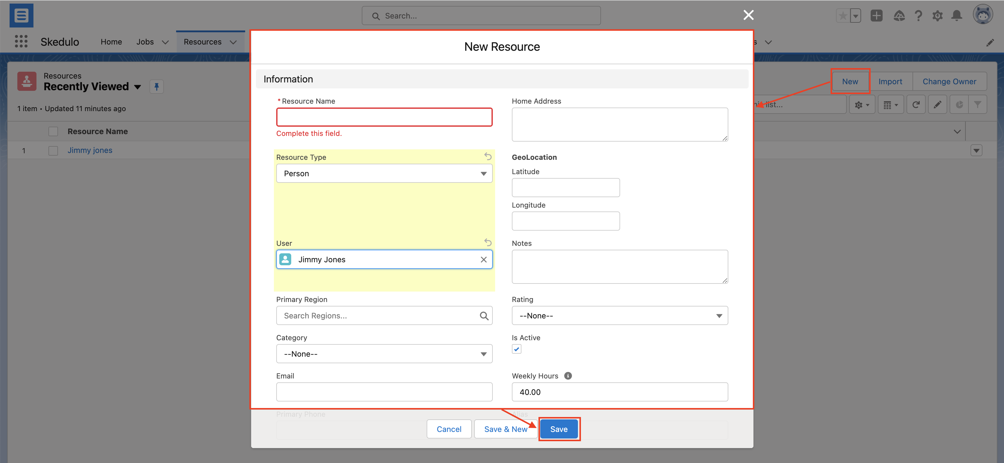 For the Skedulo on Salesforce solution, all deskless workers will require a user record and a resource record to access the mobile application. In the pervious lesson ‘Creating Salesforce users‘ we explored the steps needed to set up a user record, that included setting up a user record for a resource. When creating a resource record, you will need to link it to a corresponding user record, therefore it is more productive for you to create your user records prior to creating your resource records.