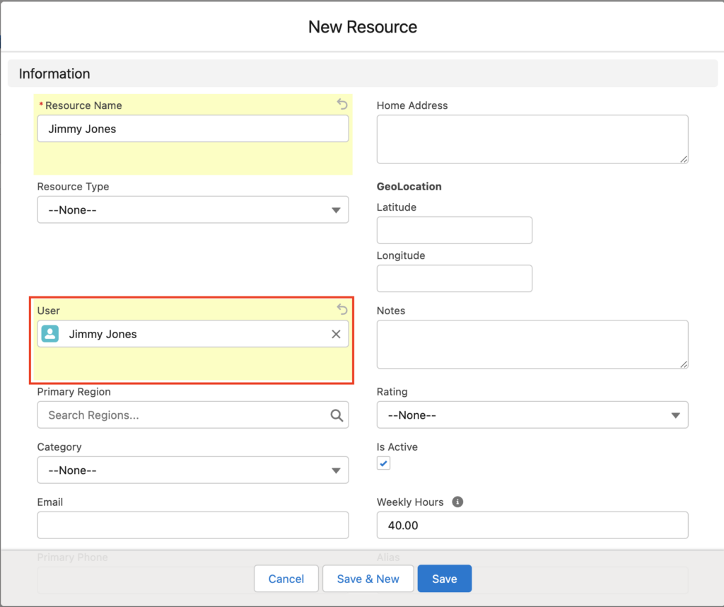 | Home address | During the allocation process, the home address against the resource is used to calculate the distances to be travelled. When a home address is populated and the record saved, Skedulo will automatically populate the Latitude and Longitude fields against the resource record. |