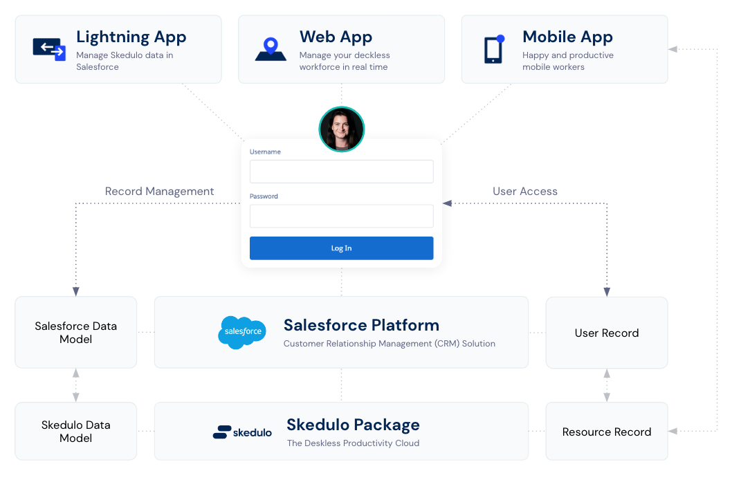 For all customers using the Skedulo on Salesforce solution, a package is installed into your Salesforce environment adding The Skedulo Deskless Productivity Cloud on top of the Salesforce platform. When the Skedulo package is installed, it will add all the necessary data required to utilise Skedulo applications and capabilities. With Salesforce acting as the platform for Skedulo, all user access is provisioned and controlled using Salesforce, granting the ability to access the Skedulo data model.