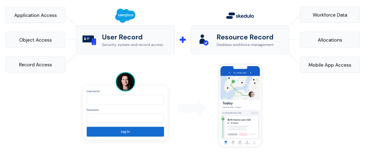 Administrators and schedulers will only require a user record but when it comes to deskless workers they will require a user record and a resource record. To access Salesforce and the Skedulo Web App only a user record is required, however Deskless workers will require a user record plus a resource record that is linked to a corresponding user record. This is because inside the Skedulo data model, all workforce data relating to a deskless worker such as availability, tags, shifts and job allocations are connected to a resource record. For all deskless workers out in the field using the Skedulo mobile app, they will require a resource record to view and manage this data.